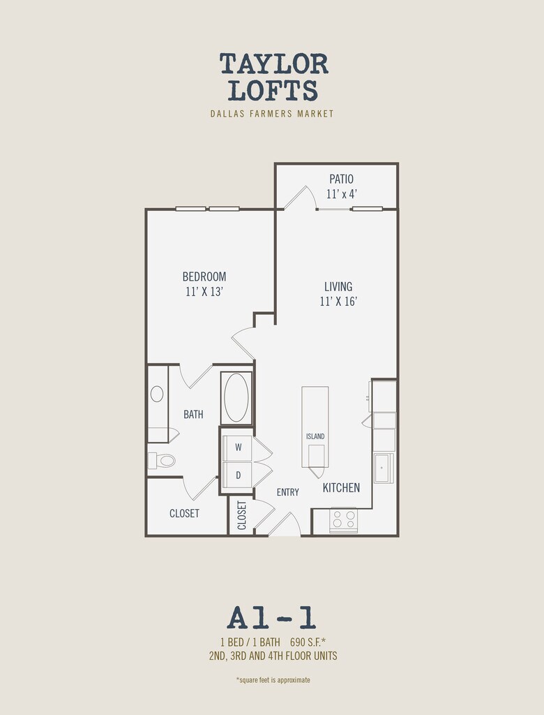 Apartment Model: A1-11 Bedroom, 1 Bath, 690 sq ftUnavailable![]()