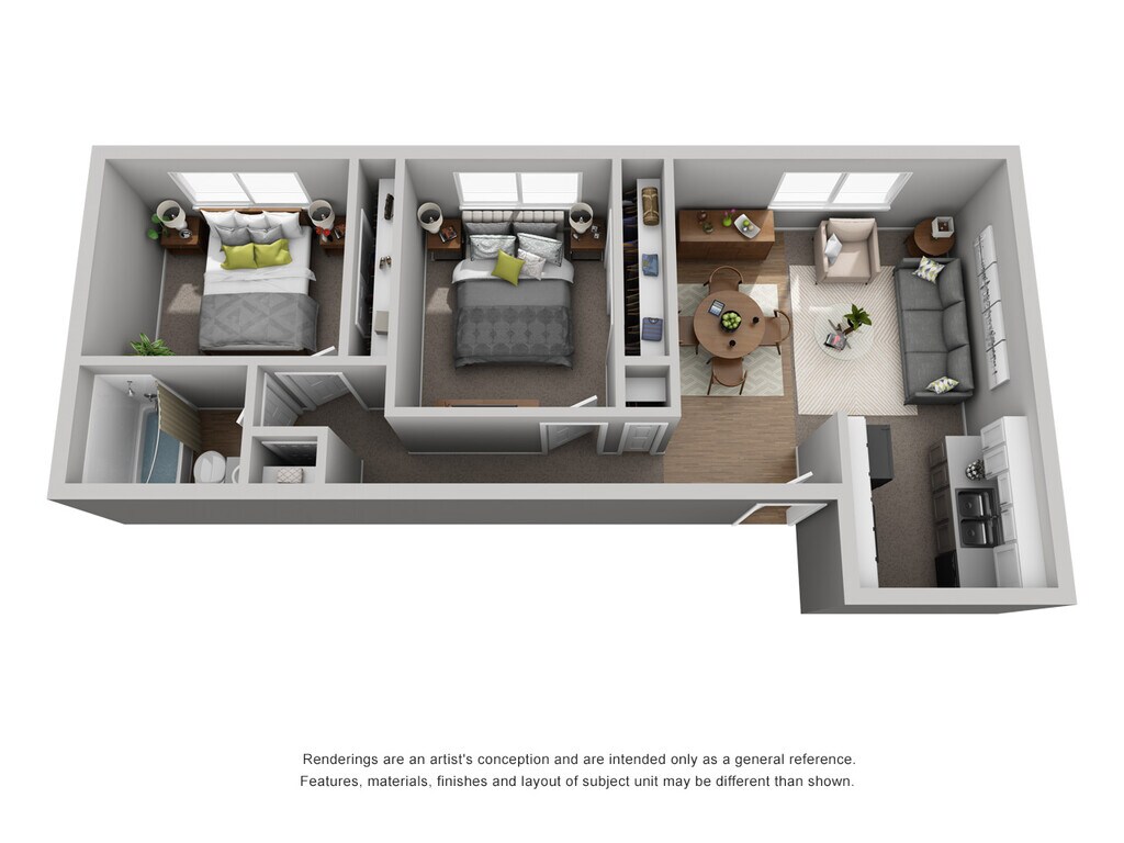 2 Beds, 1 Bath, 730 sq ftAvailable NowModel Gallery
