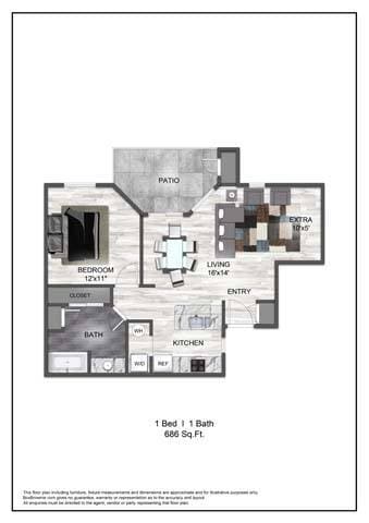 Apartment Model: A2aFrom $1,2891 Bedroom, 1 Bath, 686 sq ftAvailable NowFloor plans are artist's rendering. All dimensions are approximate. Actual product and specifications may vary in dimension or detail. Not all features are available in every rental home. Prices and availability are subject to change. Base rent is based on monthly frequency. Additional fees may apply, such as but not limited to package delivery, trash, water, amenities, etc. Deposits vary. Please see a representative for details.