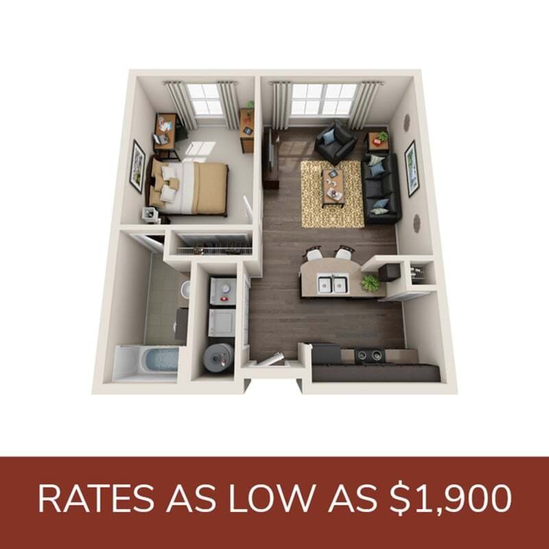 Apartment Model: A1From $1,9001 Bedroom, 1 Bath, 596 sq ftAvailable August 21, 2026![]()