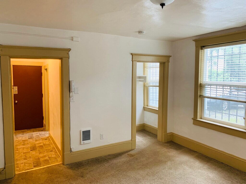 1-bedroom, 1-bath unit in the heart of Seattle’s Central District just minutes from Downtown Seattle. Quiet building with nice, respectful tenants. All 14 units in the building are 1-bedroom, 1 bath units and are all very similar in size and layout. There is a lot of wood trim and a pocket door between the living room and bedroom. There is an open alcove/closet in the living room. Carpet in living room and bedroom, vinyl in kitchen, hall and bathroom. All units are non-smoking and no smoking within 25 feet of any building door or window. We have a coin less laundry room in the building, no laundry hook-ups in the units. On-site manager lives in the building.