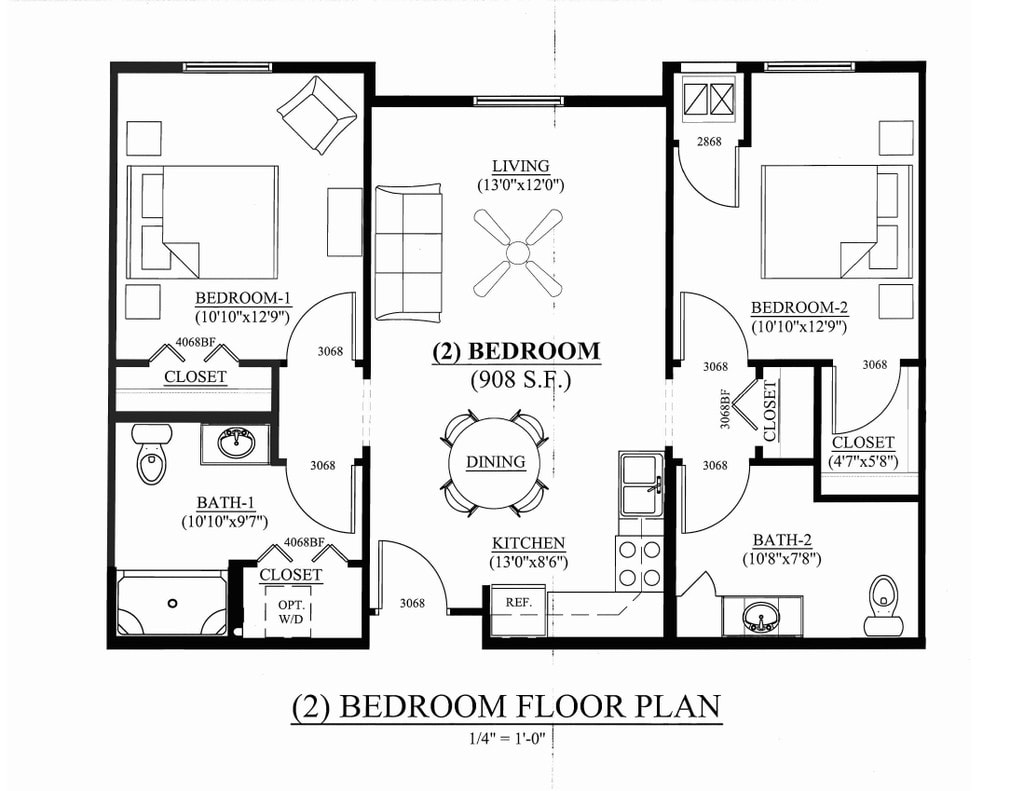 Apartment Model: Two Bedroom2 Bedroom, 1.5 Bath, 908 sq ftUnavailable![]() - Two Bedroom - Floorplan 1