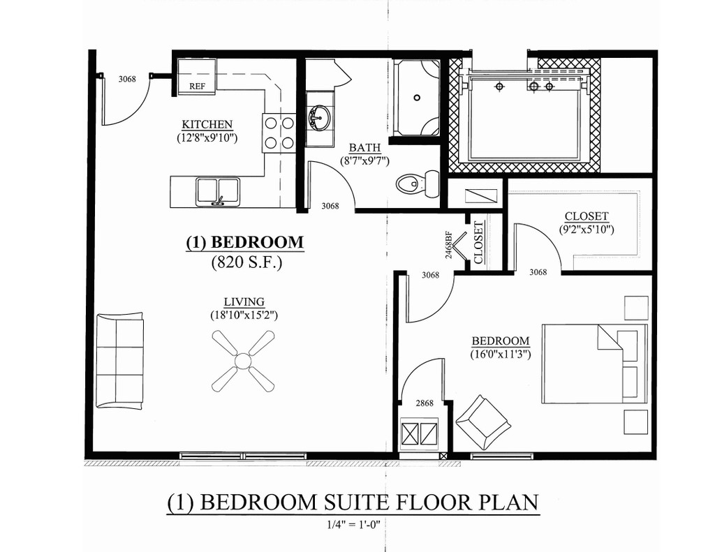 Apartment Model: One Bedroom Suite1 Bedroom, 1 Bath, 820 sq ftUnavailable![]() - One Bedroom Suite - Floorplan 1
