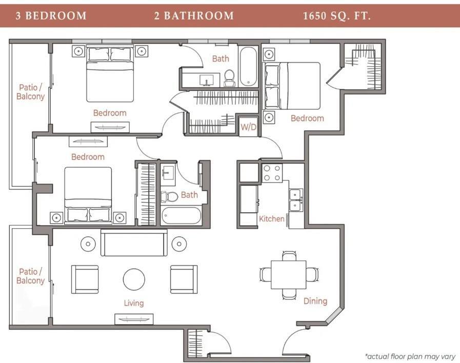 Apartment Model: 3 Bedroom 2 BathroomFrom $4,3083 Bedroom, 2 Bath, 1400-1650 sq ftAvailable Now![]()
