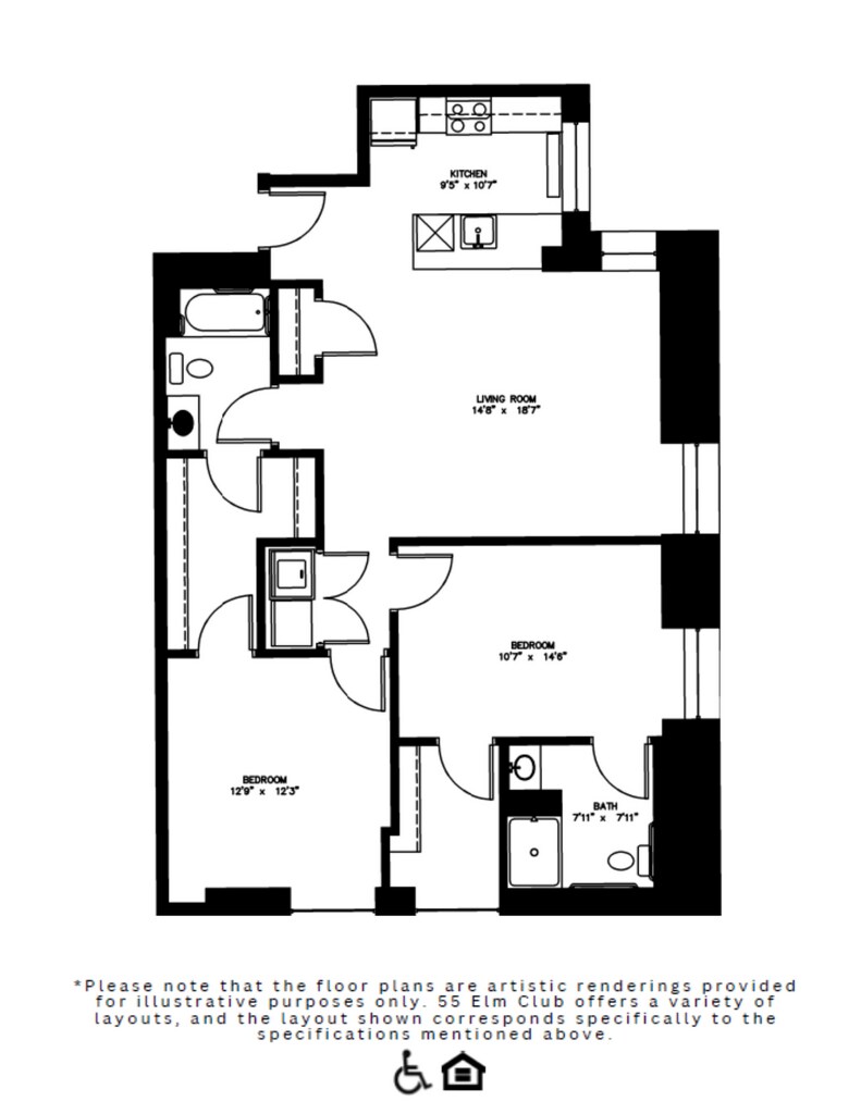 The 55 Elm Club offers Studio to 2 Bedroom apartments starting from $1,495 and having 396–1,490 sq ft. Here is the current pricing and availability: