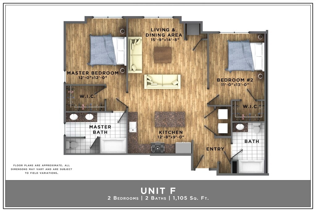 F - Floorplan Apartment Unit: 217Apartment Model: F$2,9252 Bedroom, 2 Bath, 1105 sq ftAvailable June 15, 2026