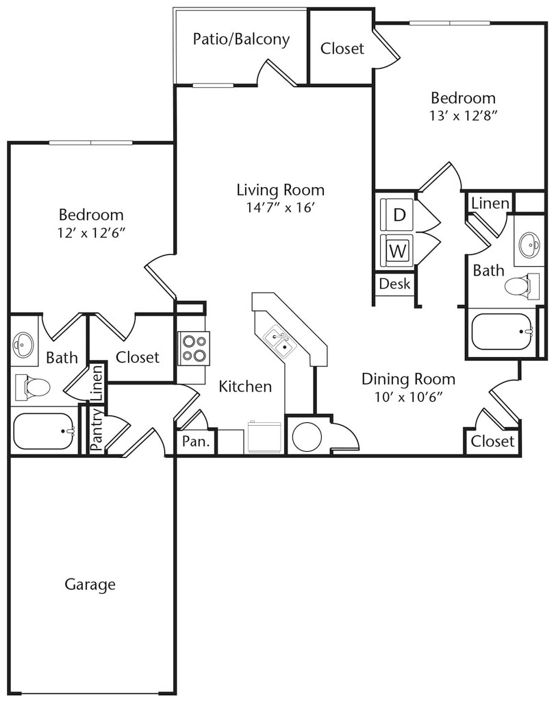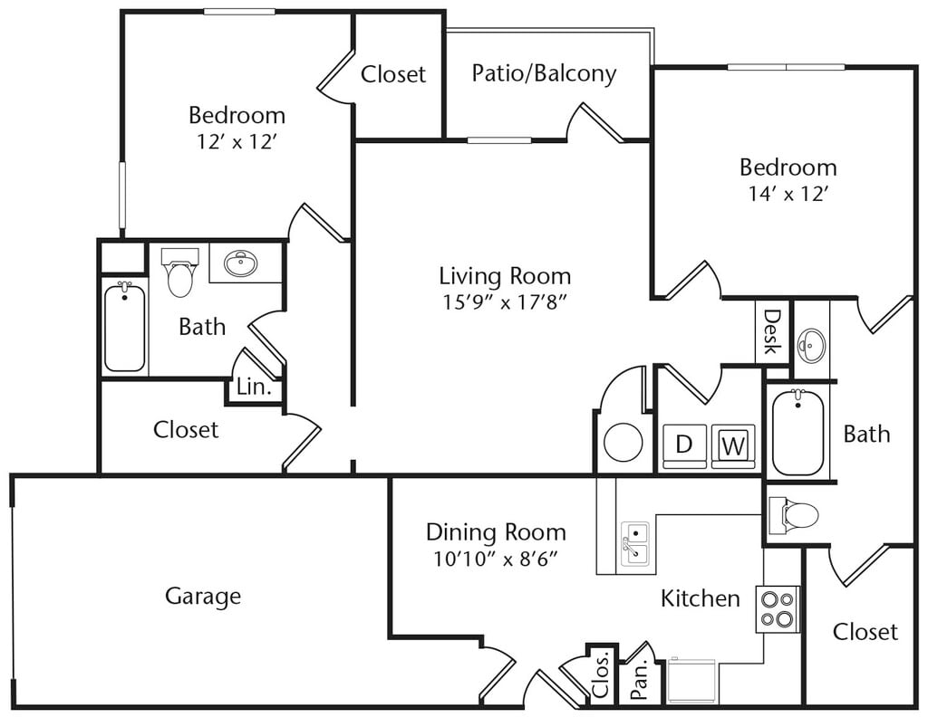 2 Beds, 2 Baths, 1305 sq ftAvailable Dec 31Largest 2 BedroomThis is the largest 2 Bedroom at this PropertyModel Gallery