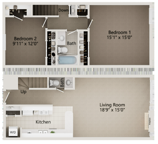 Apartment Model: 1 Bed 1.5 Bath - Townhome$1,1001 Bedroom, 1.5 Bath, 900 sq ftAvailable Now![]()