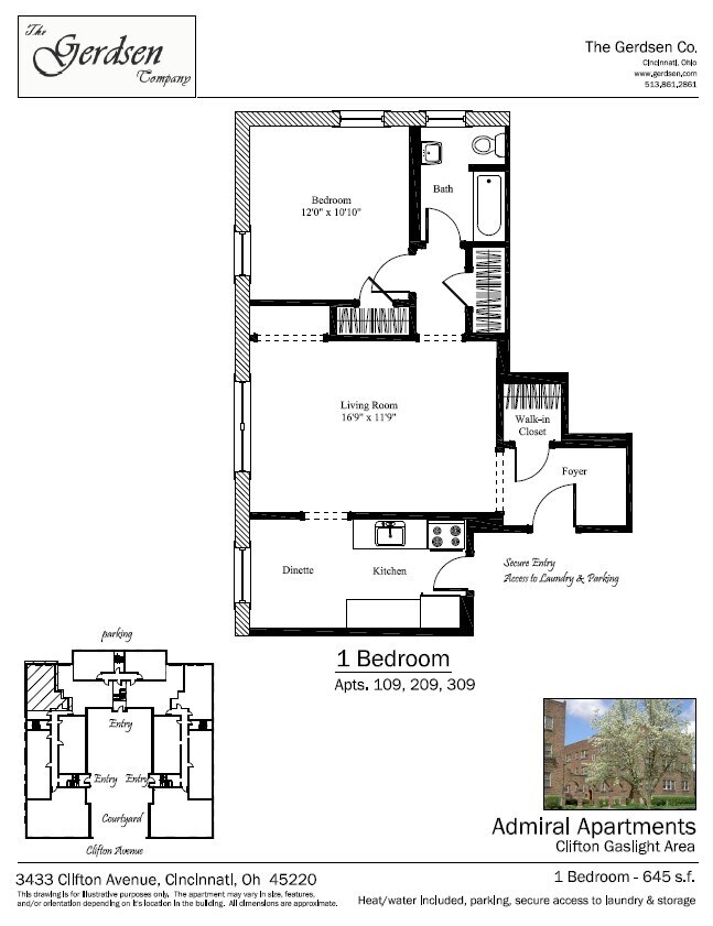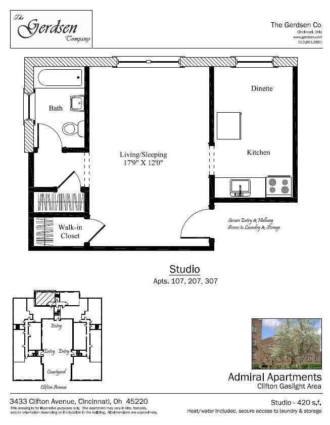 The Admiral is located in the Gaslight District of Clifton at 3433 Clifton Avenue, with 3 tenant entrances off a beautifully lit, quiet courtyard. The Admiral is a grand building, featuring brick arches and columns, much character and personality, within walking distance to the shops, dining, and entertainment of the Clifton/Ludlow Business area. It features Studio, One (1) and Two (2) bedroom apartments styles.
