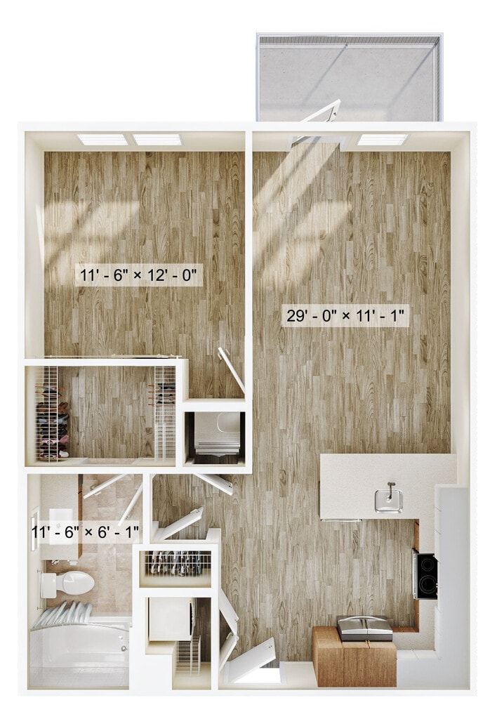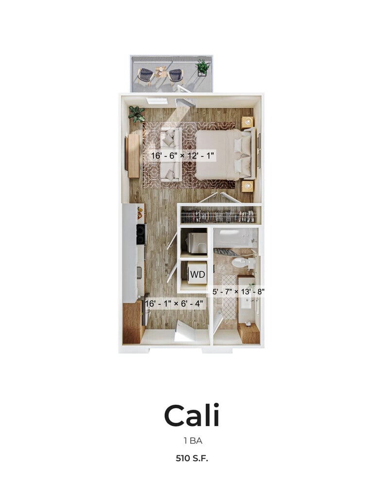 Cali - Floorplan 2 Apartment Unit: 127Apartment Model: Cali$1,599Studio, 1 Bath, 510 sq ftAvailable NowGaia