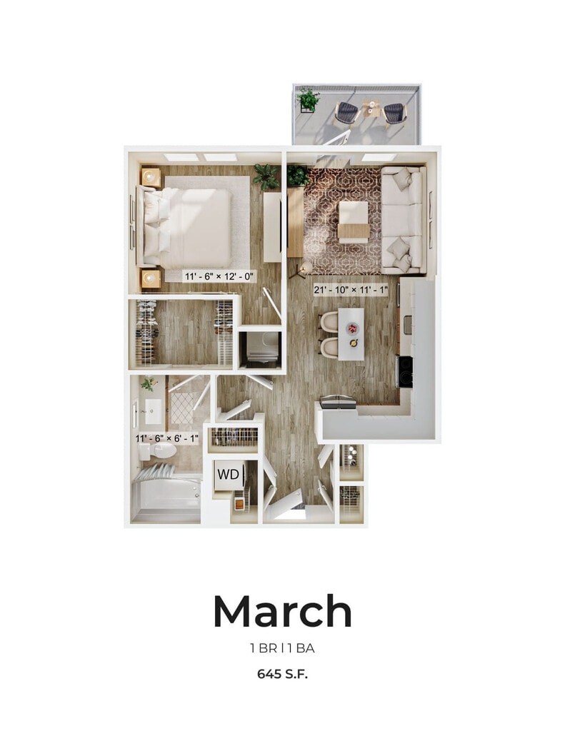 Apartment Model: MarchFrom $1,7751 Bedroom, 1 Bath, 645 sq ftAvailable Now![]()