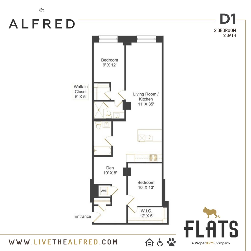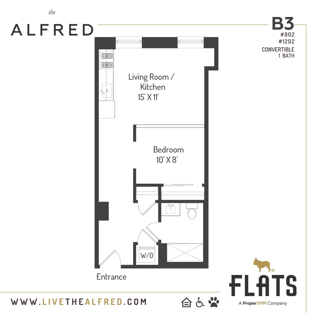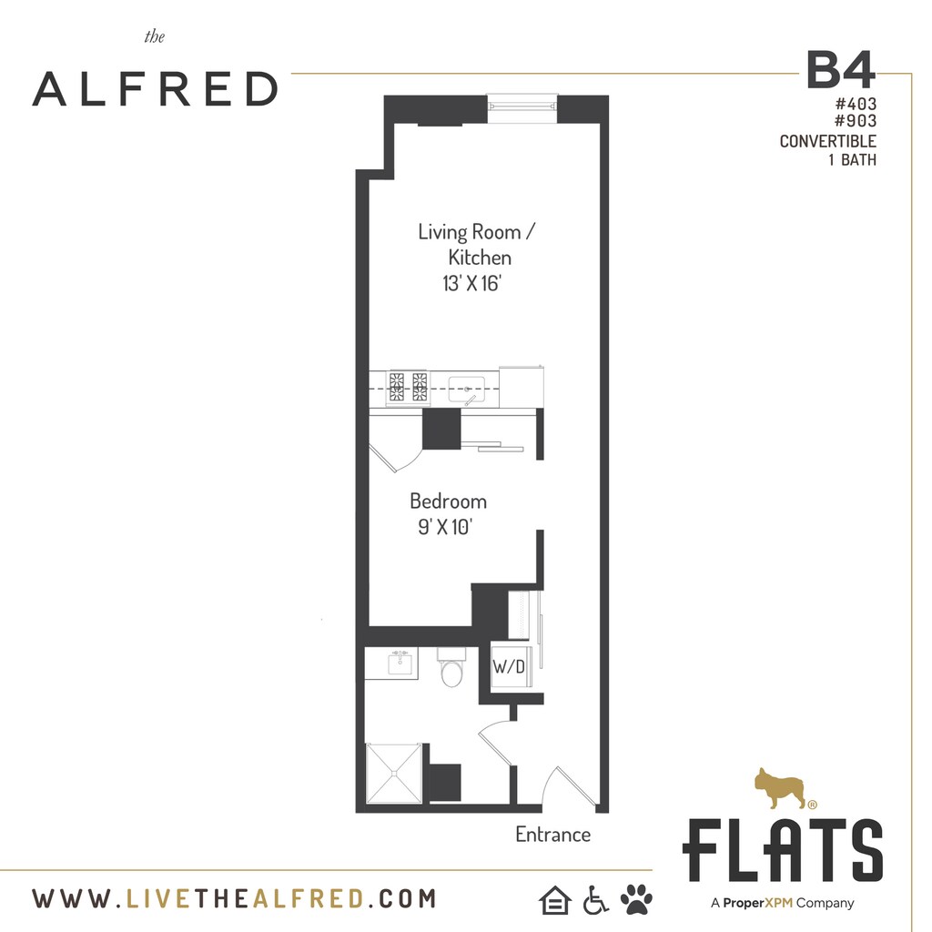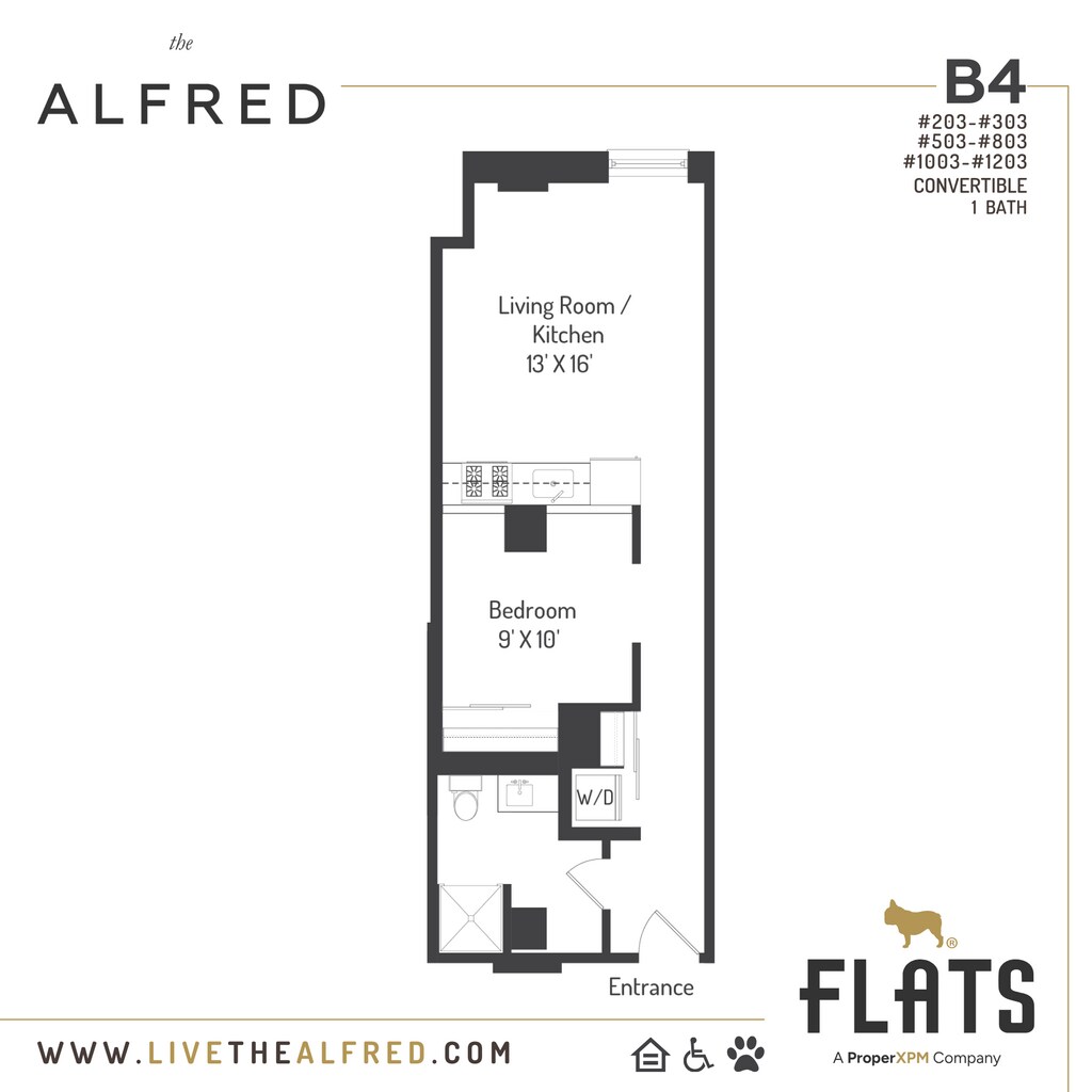 The Alfred offers Studio to 2 Bedroom apartments starting from $1,895 and having 523–1,185 sq ft. Here is the current pricing and availability: