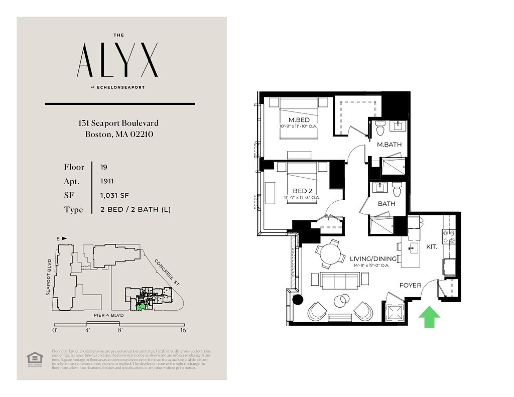 The Alyx at EchelonSeaport is a defining contemporary landmark designed by internationally lauded Kohn Pedersen Fox architects of New York. The impressive stepped tower design takes inspiration from Bostons Victorian neighborhoods full of brick and brownstone row houses, and puts a modern spin on it, showcasing oversized windows with city, courtyard, and water views. On the interior, the design team at world-renown Jeffrey Beers International, crafted the lobby and amenity spaces to feel like an extension of ones own living room; warm, inviting, and comfortable. Designed with a sense of community, the amenity experiences encourage residents to gather and socialize.