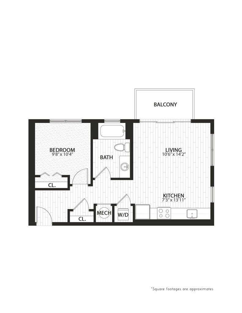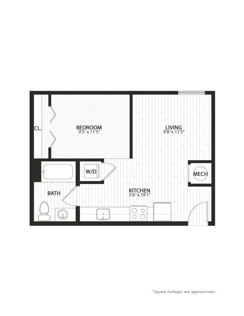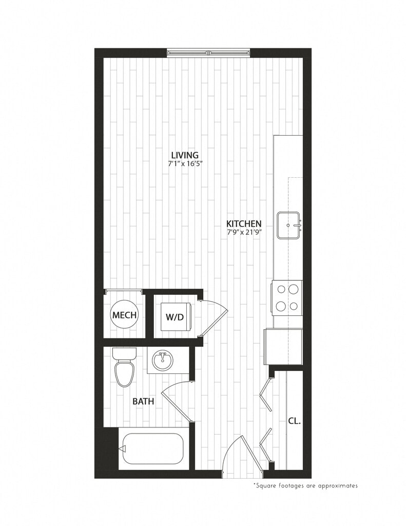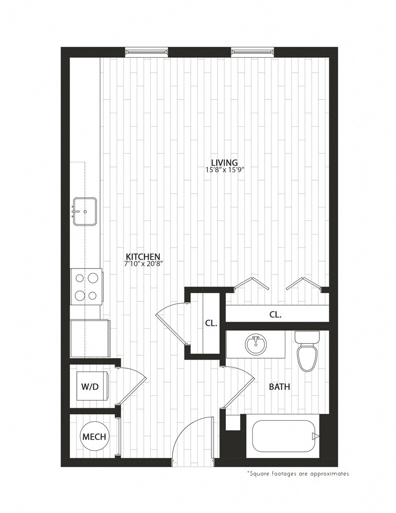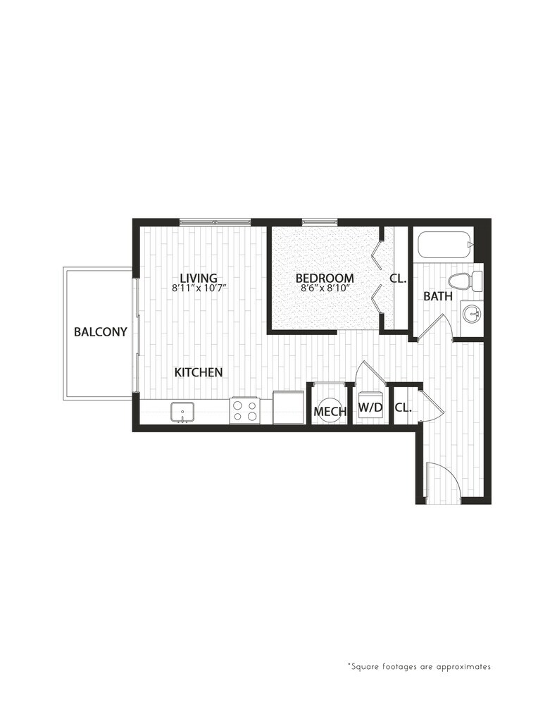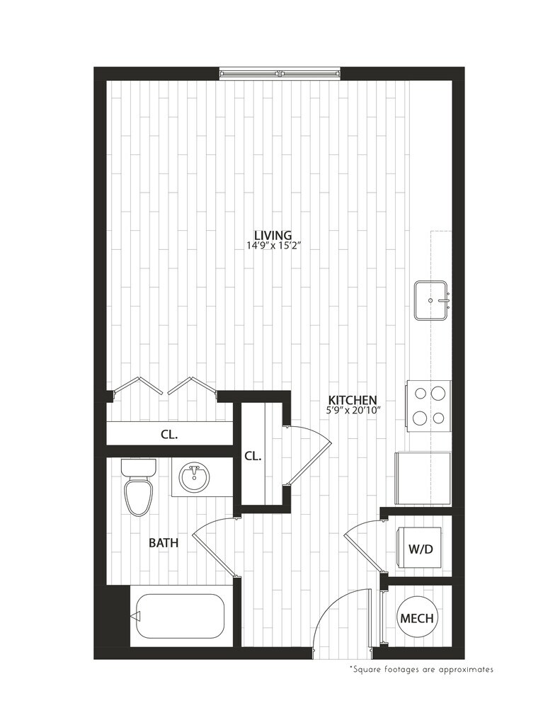 Studio 1B - Floorplan 1 Apartment Unit: A210Apartment Model: Studio 1B$1,075Studio, 1 Bath, 416 sq ftAvailable Now![]()
