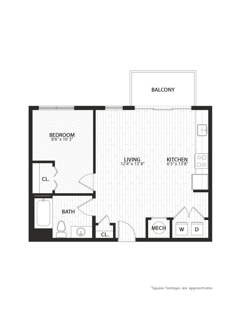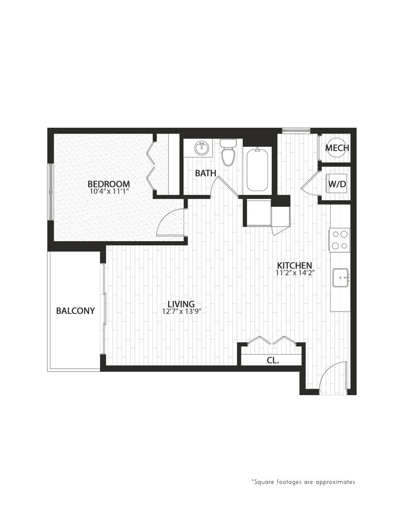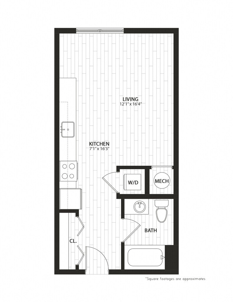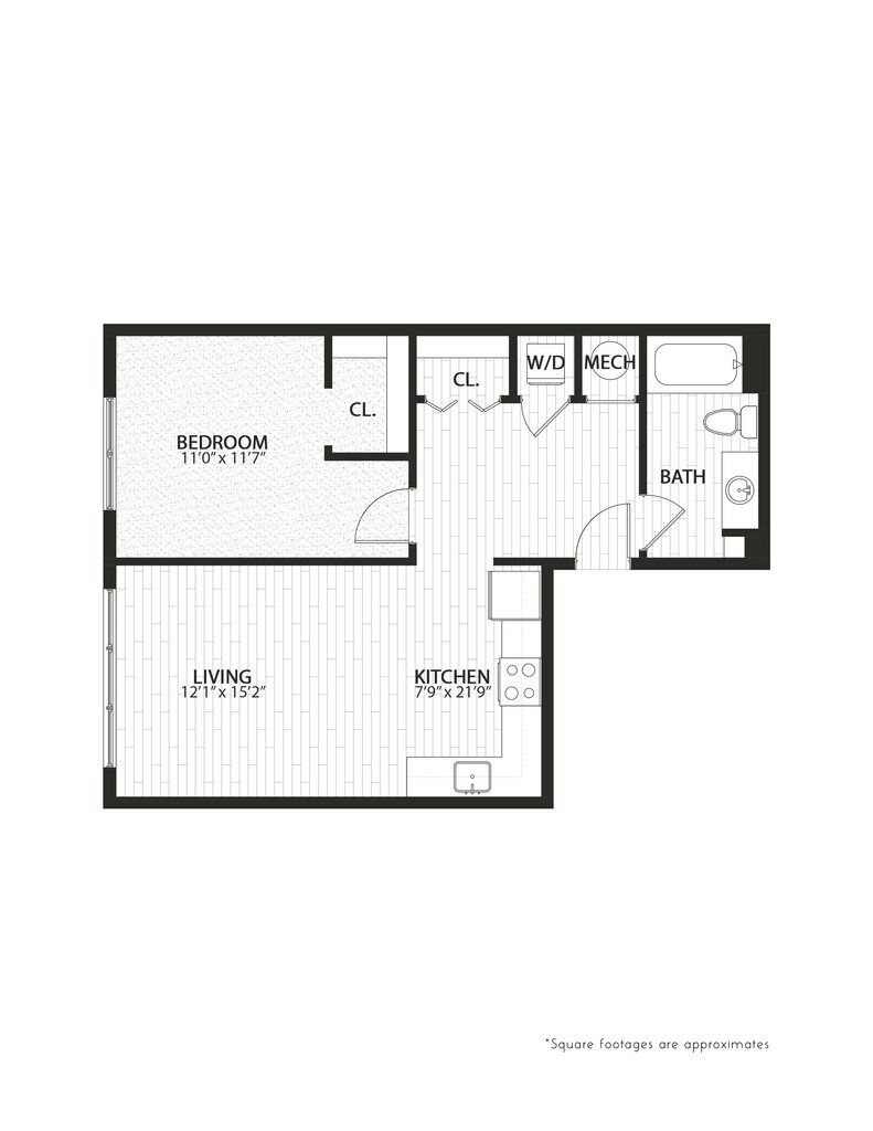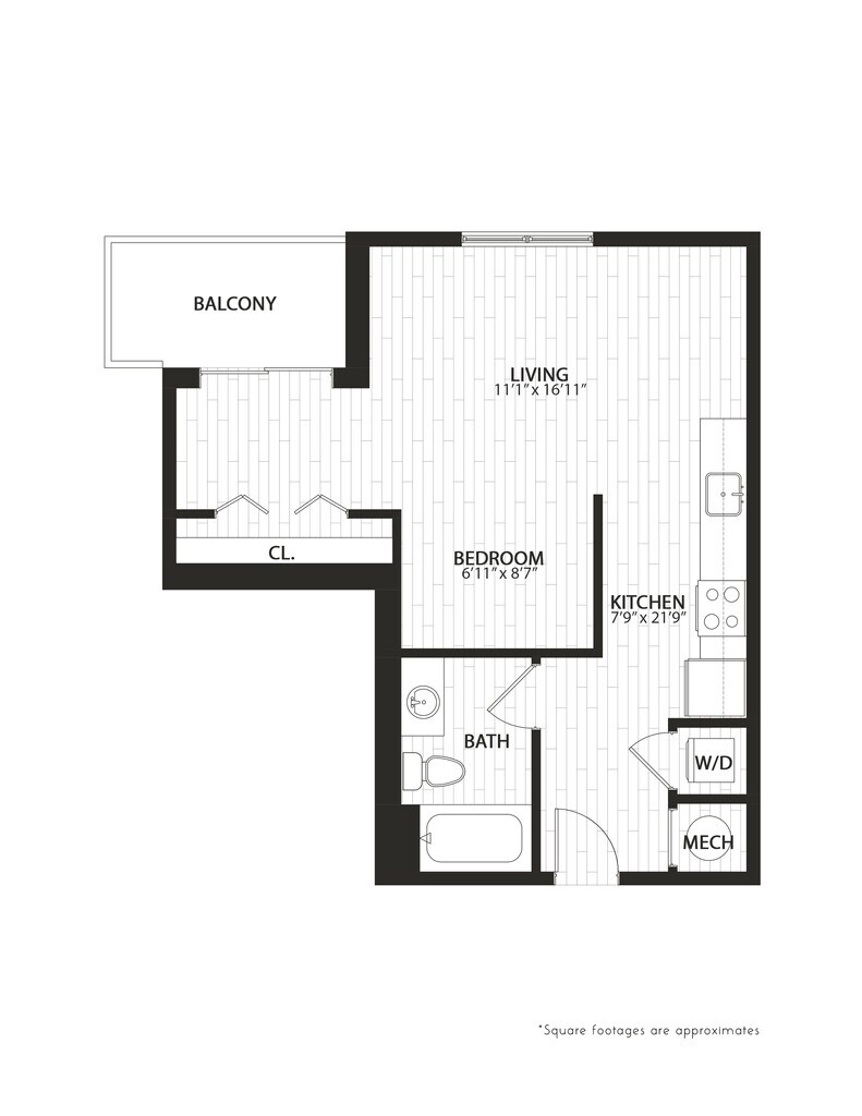 Studio 1B - Floorplan 1 Apartment Unit: A210Apartment Model: Studio 1B$1,075Studio, 1 Bath, 416 sq ftAvailable Now![]()
