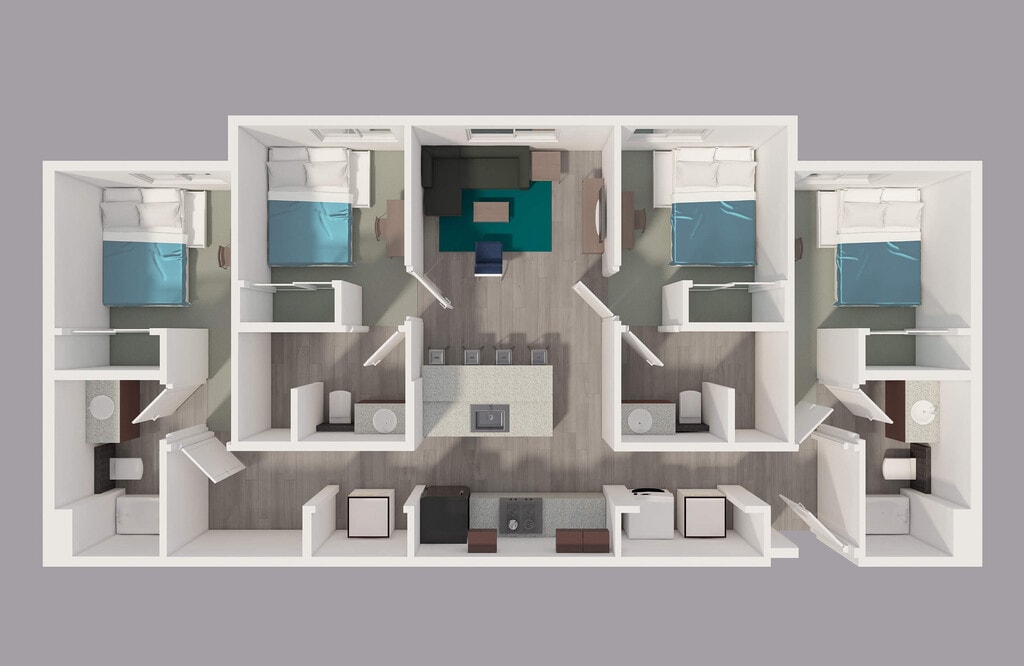 4 bed 4 Bath - Floorplan 1 Apartment Unit: PrivateApartment Model: 4 bed 4 Bath$5534 Bedroom, 4 Bath, sq ftAvailable August 14, 2026
