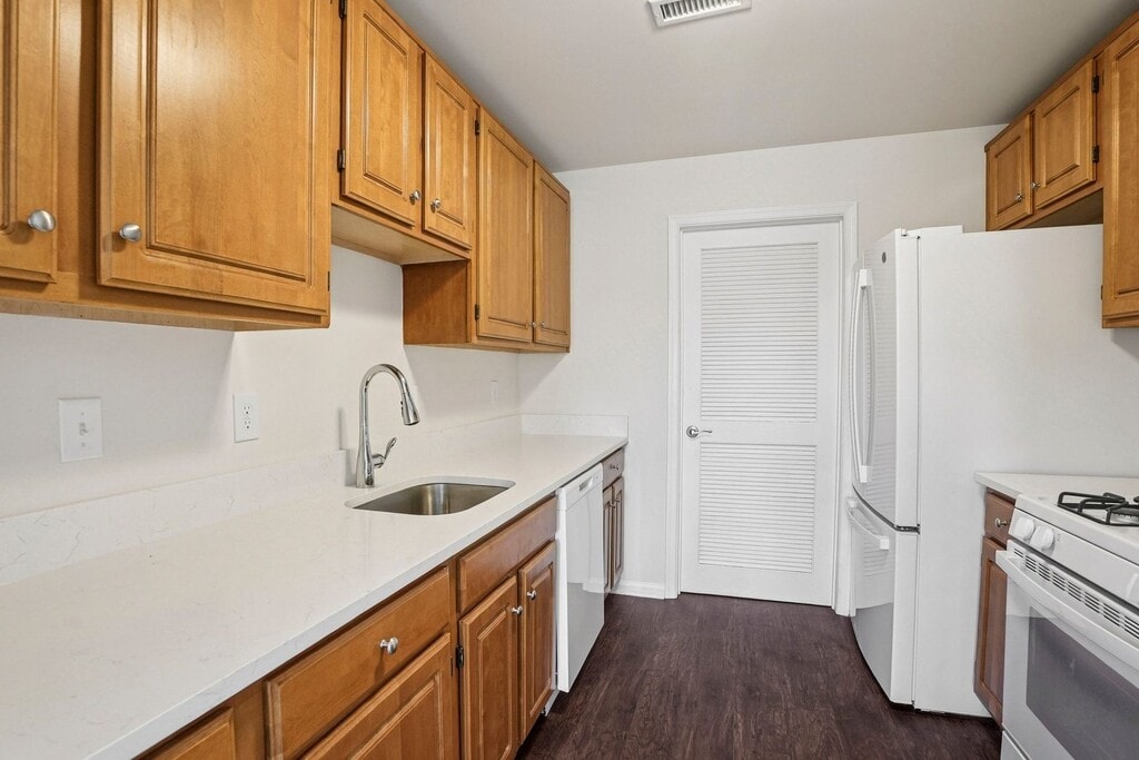 Our 2nd floor non-garage end unit features vaulted ceilings, 2 bedrooms, 2 bathrooms, a galley kitchen with extra tall cabinets. Full size appliances included along with a large laundry room. *Rental Rate quoted is subject to change based upon lease term.