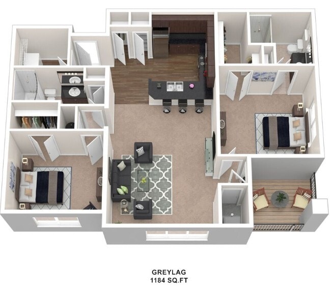 Apartment Model: GreylegCall For Rates2 Bedroom, 2 Bath, 1047-1184 sq ftAvailable NowGreyleg - Floorplan 1 3 Bedrooms