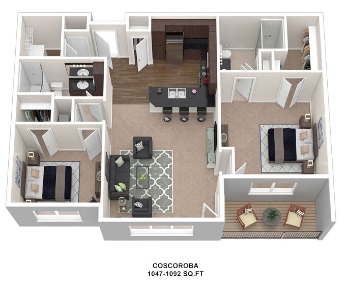 Apartment Model: CoscorobaCall For Rates2 Bedroom, 2 Bath, 1047-1092 sq ftAvailable NowCoscoroba - Floorplan 1 Greyleg