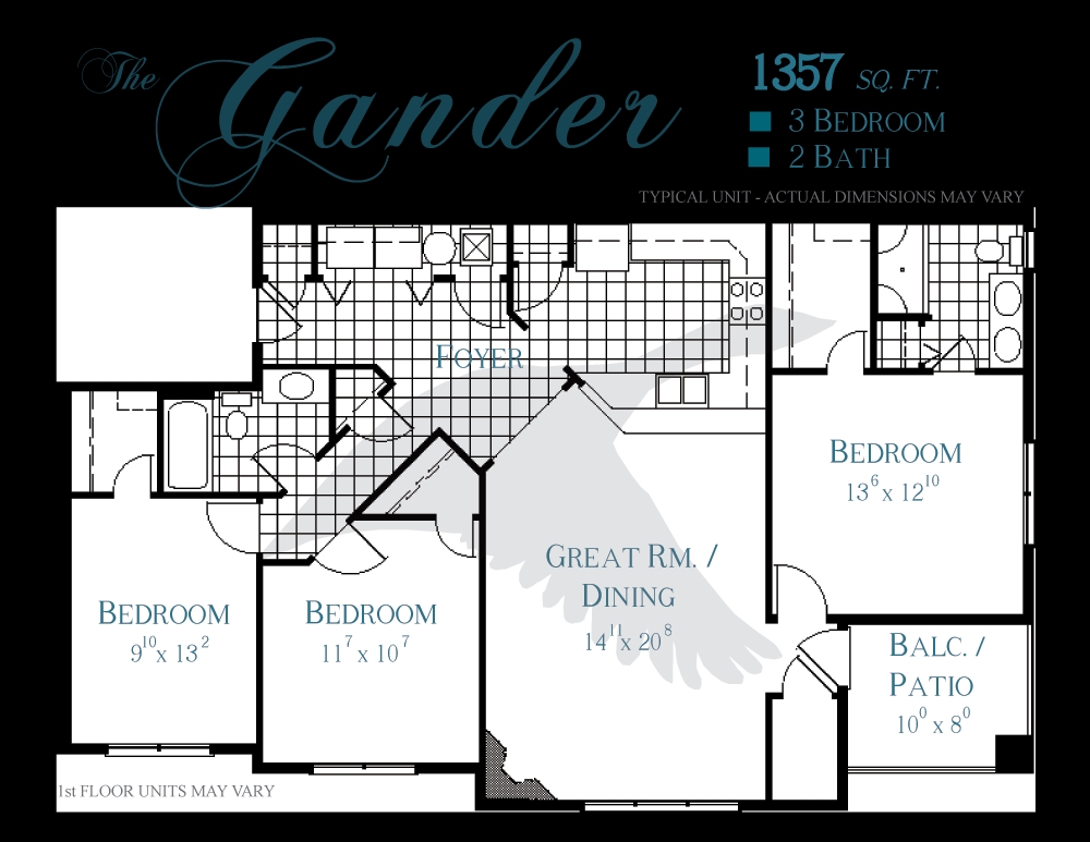 Apartment Model: The GanderCall For Rates3 Bedroom, 2 Bath, 1357 sq ftAvailable NowFloorplansPhotos![]()