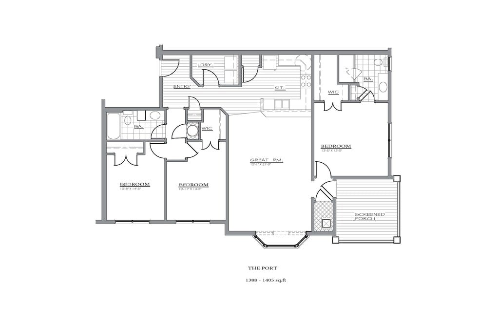 - 3 Bedrooms- The Port3 Beds, 2 Baths, 1388-1405 sq ft- Model Gallery- Floorplans- Photos- Availability Details- Availability Date - Unit - Sq Ft - Call for Availability - The Port - 1388-1405 sq ft - Model Amenities and Features- Features- Air Conditioning