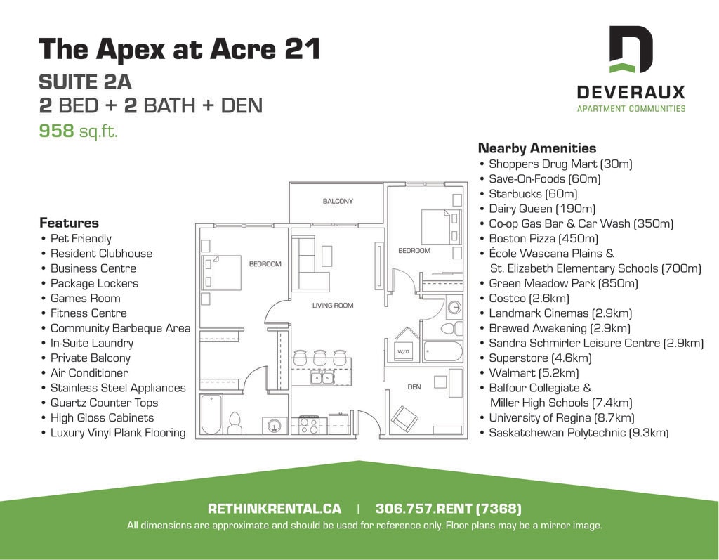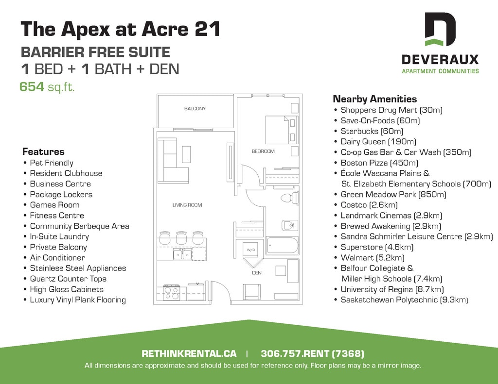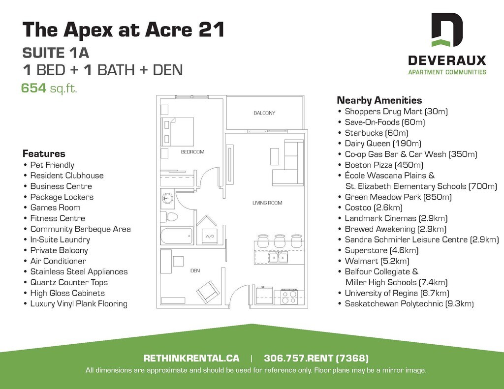 The Apex at Acre 21 is a pet-friendly community that offers spacious one and two bedroom + den apartments for rent in the Greens on Gardiner neighbourhood of southeast Regina. Suites are fully equipped with central heat, air conditioning, full-size stainless-steel appliances (including dishwasher and microwave), in-suite laundry and upgraded modern finishes such as quartz countertops and luxury vinyl plank flooring.Rent includes water, energy, in-suite laundry and one electrified parking spot.The Apex at Acre 21 includes fun and convenient amenities!* Same-day application approvals are available.* Rates are based on a one-year lease and may vary by floor/layout.* Pet restrictions apply. * Reduced security deposits for seniors.