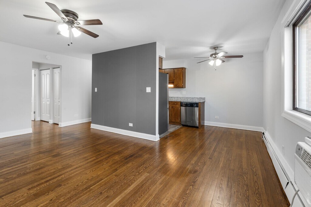 Apartment Features: —Dark Wood Kitchen Cabinets —Granite Countertops with Deep Undermount Sink —Stainless Steel Appliances includes Dishwasher —Renovated Bathroom —Dark Wood Flooring —Top Floor with Great Air Flow Floorplan —Bedroom has great closet space —LED Lighting —Heat/Water Included. —AC Wall Unit Included —Pets Welcome