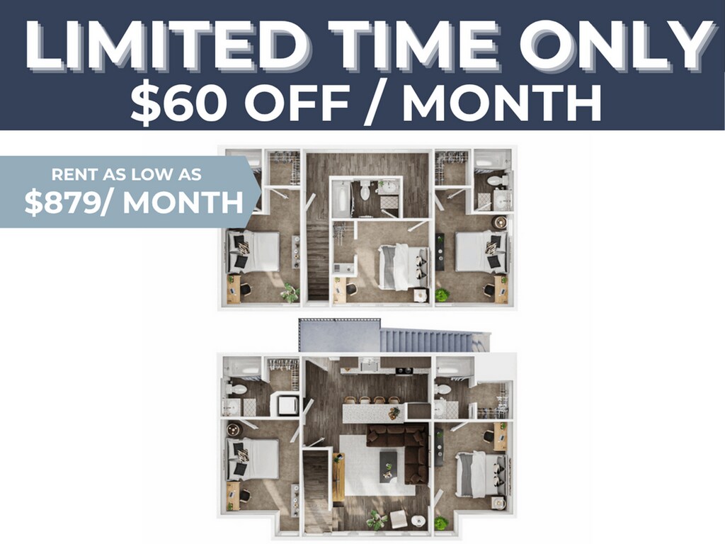 4BR/4BA - Townhome Timberline - Floorplan Apartment Unit: PrivateApartment Model: 4BR/4BA - Townhome Timberline$1,0704 Bedroom, 4 Bath, 1716 sq ftAvailable NowApartment Unit: PrivateApartment Model: 4BR/4BA - Townhome Timberline$1,0704 Bedroom, 4 Bath, 1716 sq ftAvailable NowApartment Unit: PrivateApartment Model: 4BR/4BA - Townhome Timberline$1,0704 Bedroom, 4 Bath, 1716 sq ftAvailable Now4BR/4BA - Chalet