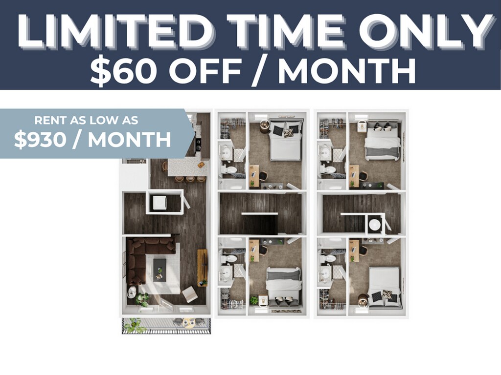 Base Rent$930Required Monthly Fees$140Total Monthly Price$1,070Cheapest 4 BedroomThis is the cheapest 4 Bedroom at this PropertyModel Gallery