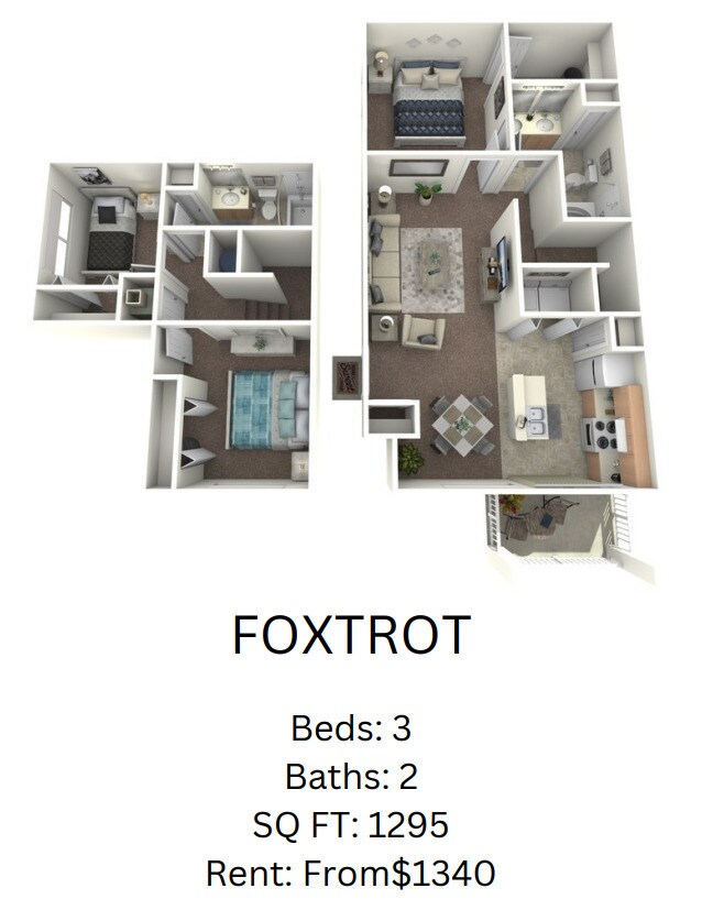 Apartment Model: Foxtrot$1,4853 Bedroom, 2 Bath, 1295 sq ftAvailable November 24, 2025![]()
