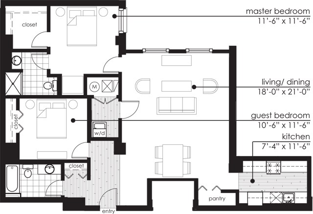 1 Bed, 1 Bath, 720-774 sq ftAvailable NowLargest 1 BedroomThis is the largest 1 Bedroom at this PropertyModel Gallery