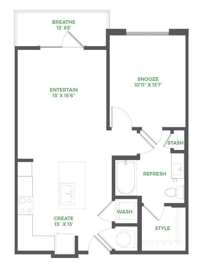 A1 - Floorplan 1 Apartment Unit: 1309Apartment Model: A1$1,5611 Bedroom, 1 Bath, 708 sq ftAvailable December 6, 2025Floorplan A2