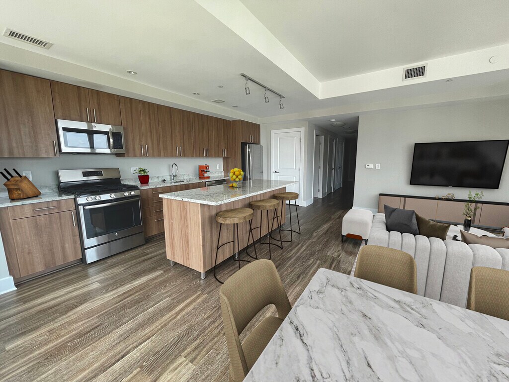 The Bartlett is a luxury apartment community located in Pentagon City, part of National Landing, offering apartment homes with flexible layouts and high-end finishes. Select floor plans feature built-in Ori automated home office systems designed for modern, remote work. Apartments include stainless steel appliances, gas ranges, granite countertops, in-unit laundry, oversized closets, deep-soaking tubs, and hardwood-style flooring. Community amenities span over 40,000 square feet and include rooftop lounges, a resort-style pool with sundeck, coworking space, spa-quality fitness center, pet spa and dog park, EV charging, and more. Residents also enjoy a seamless experience through a convenient mobile app, providing access to community spaces, amenities, guest services, and maintenance requests, reflecting our dedication to innovative technology, elevated service standards, and community enjoyment.