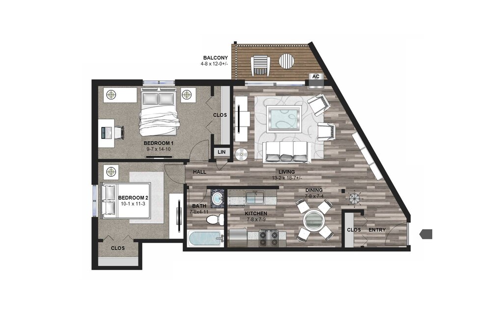 2 Beds, 1 Bath, 788 sq ftTotal Monthly PriceAvailable Dec 4Model Gallery