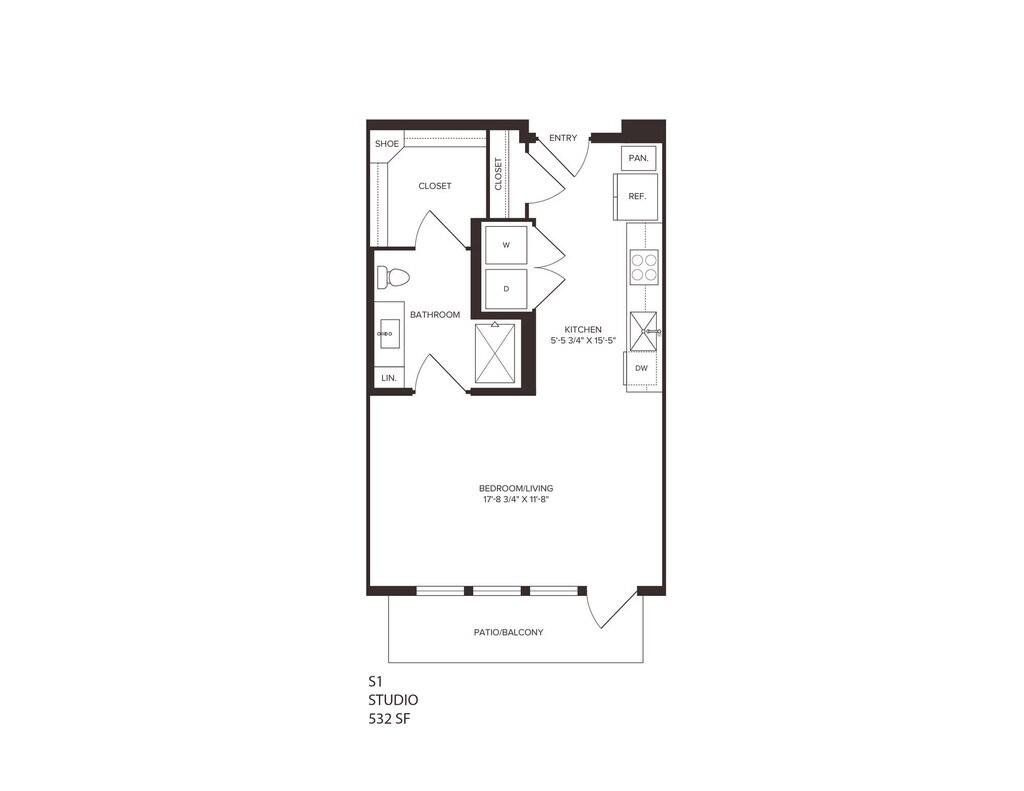 S1 - Floorplan 1 Apartment Unit: 670Apartment Model: S1Studio, 1 Bath, 532 sq ftAvailable January 27, 20261 Bedroom