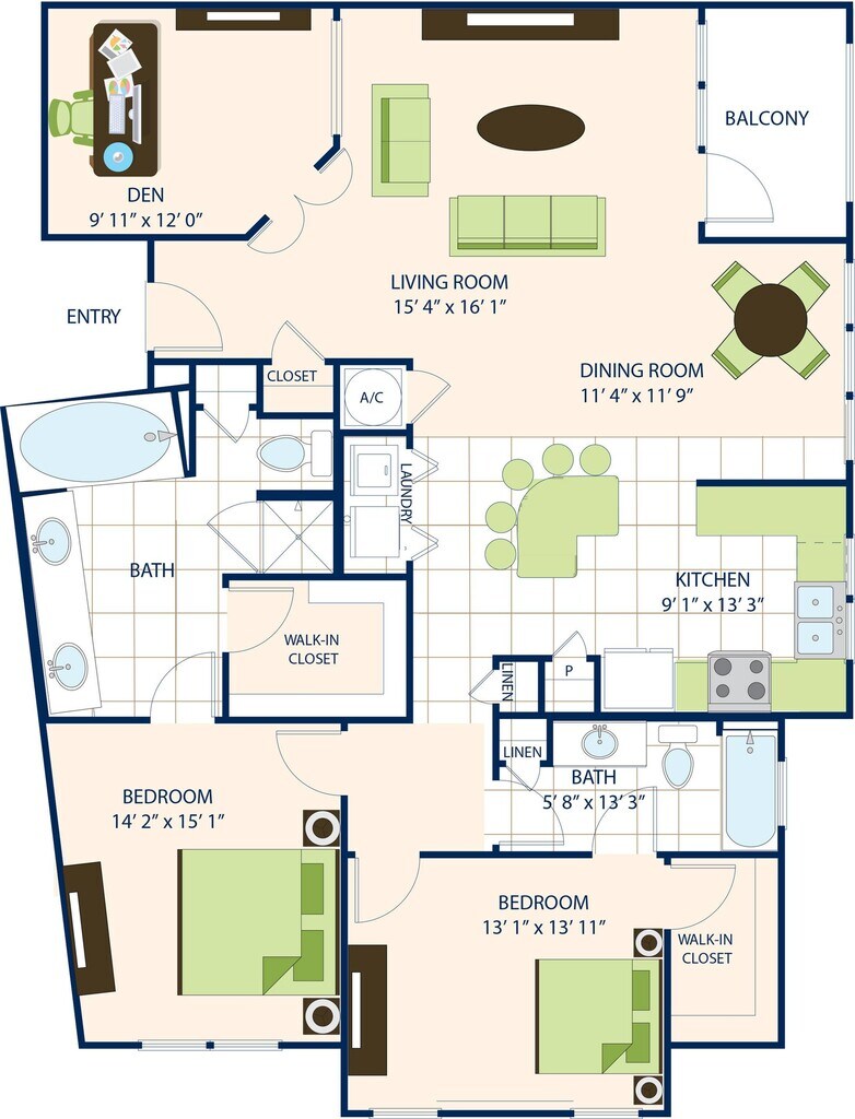 Two Bedroom Two Bath (1171 SF) - Floorplan 1 Apartment Unit: 1318Apartment Model: Two Bedroom Two Bath (1171 SF)From $1,8392 Bedroom, 2 Bath, 1171 sq ftAvailable NowTwo Bedroom Two Bath with Den (1321 SF)