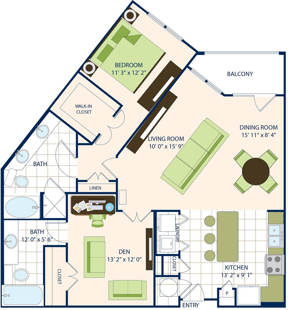 Apartment Model: One Bedroom Two Bath with Den (1317 SF)From $2,0201 Bedroom, 2 Bath, 1317 sq ftAvailable NowFloor plans are artist's rendering. All dimensions are approximate. Actual product and specifications may vary in dimension or detail. Not all features are available in every rental home. Prices and availability are subject to change. Base rent is based on monthly frequency. Additional fees may apply, such as but not limited to package delivery, trash, water, amenities, etc. Deposits vary. Please see a representative for details.
