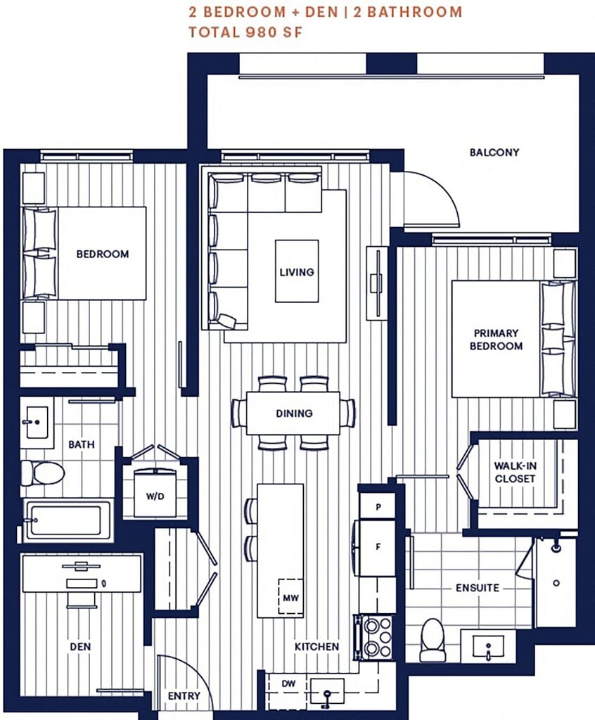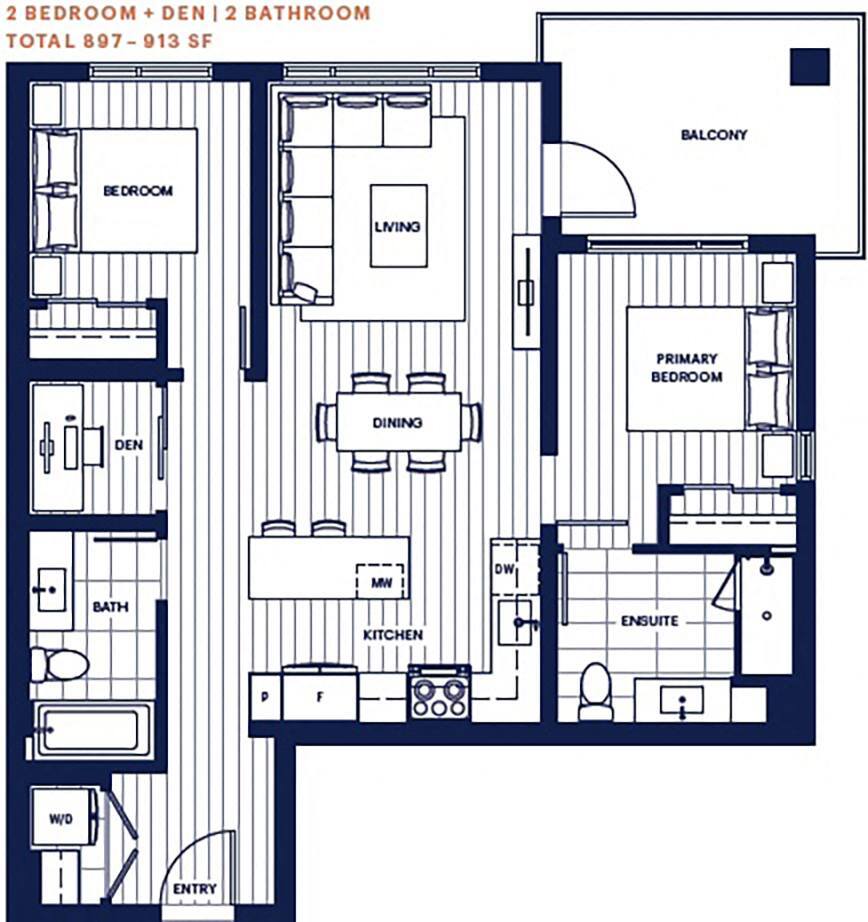 Two Bedroom and Den - Floorplan 6 Apartment Unit: 0359Apartment Model: Two Bedroom and Den2 Bedroom, 2 Bath, 832 sq ftAvailable NowApartment Unit: 0459Apartment Model: Two Bedroom and Den2 Bedroom, 2 Bath, 832 sq ftAvailable NowTwo Bedroom 2 Bath
