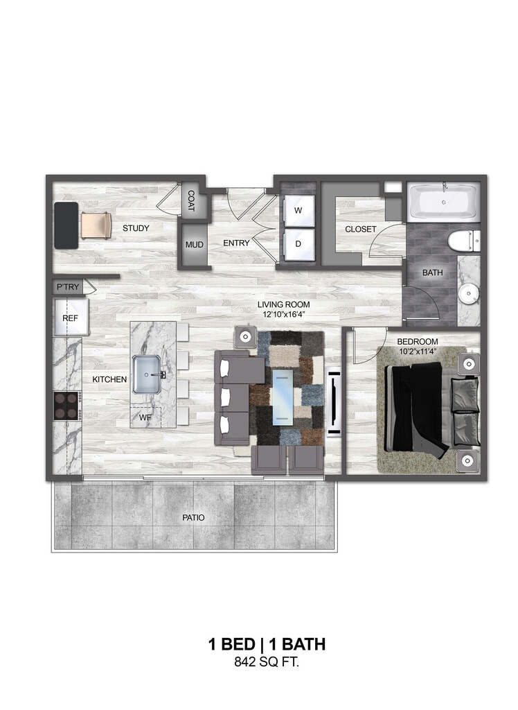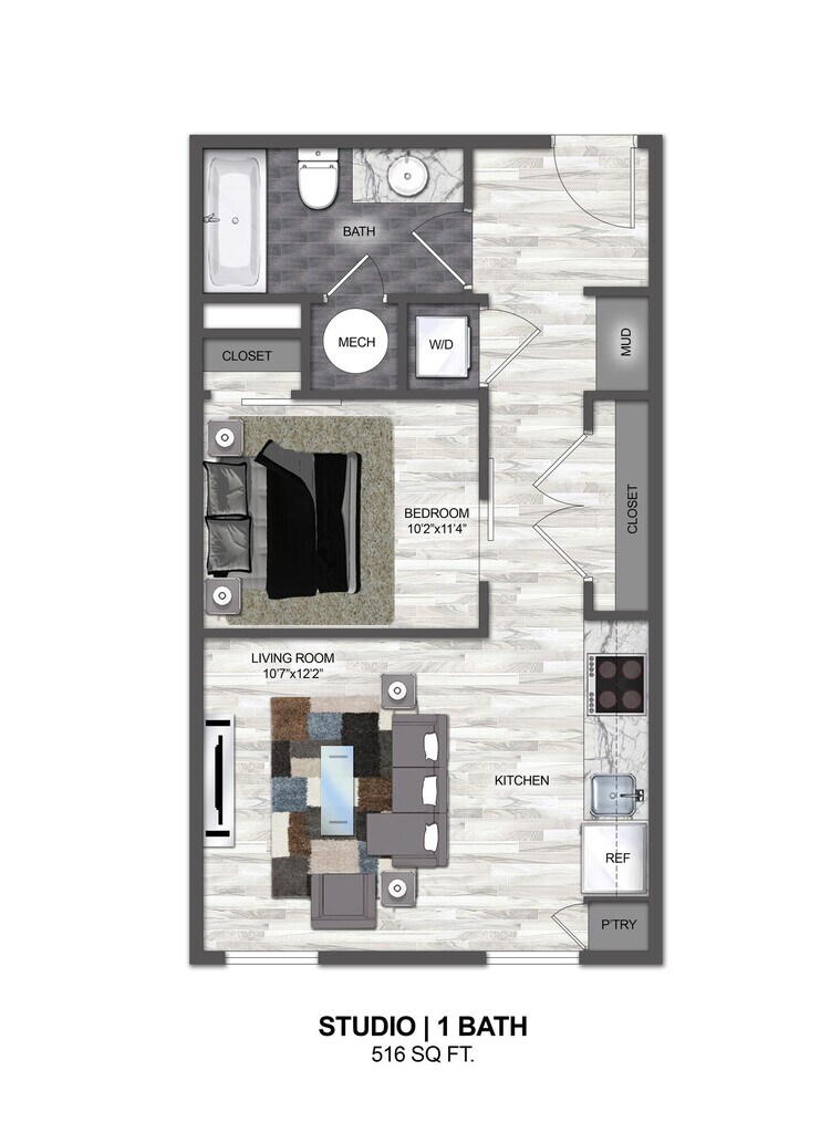 Apartment Model: E2$1,812Studio, 1 Bath, 516 sq ftAvailable NowFloor plans are artist's rendering. All dimensions are approximate. Actual product and specifications may vary in dimension or detail. Not all features are available in every rental home. Please see a representative for details.