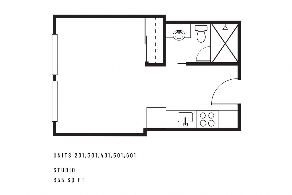 Studio A - Floorplan Apartment Unit: 401Apartment Model: Studio A$1,698Studio, 1 Bath, 355 sq ftAvailable April 5, 2026![]()