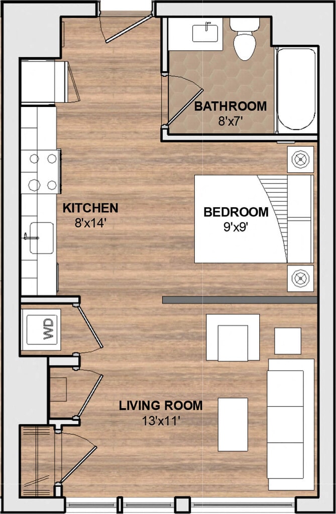 221 B - Floorplan 1 Apartment Unit: 221-306Apartment Model: 221 B$2,974Studio, 1 Bath, 494 sq ftAvailable March 7, 20261 Bedroom