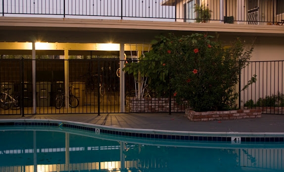 The property is a courtyard style building with a pool in the center. The entry gates are locked and require a key to enter the building.