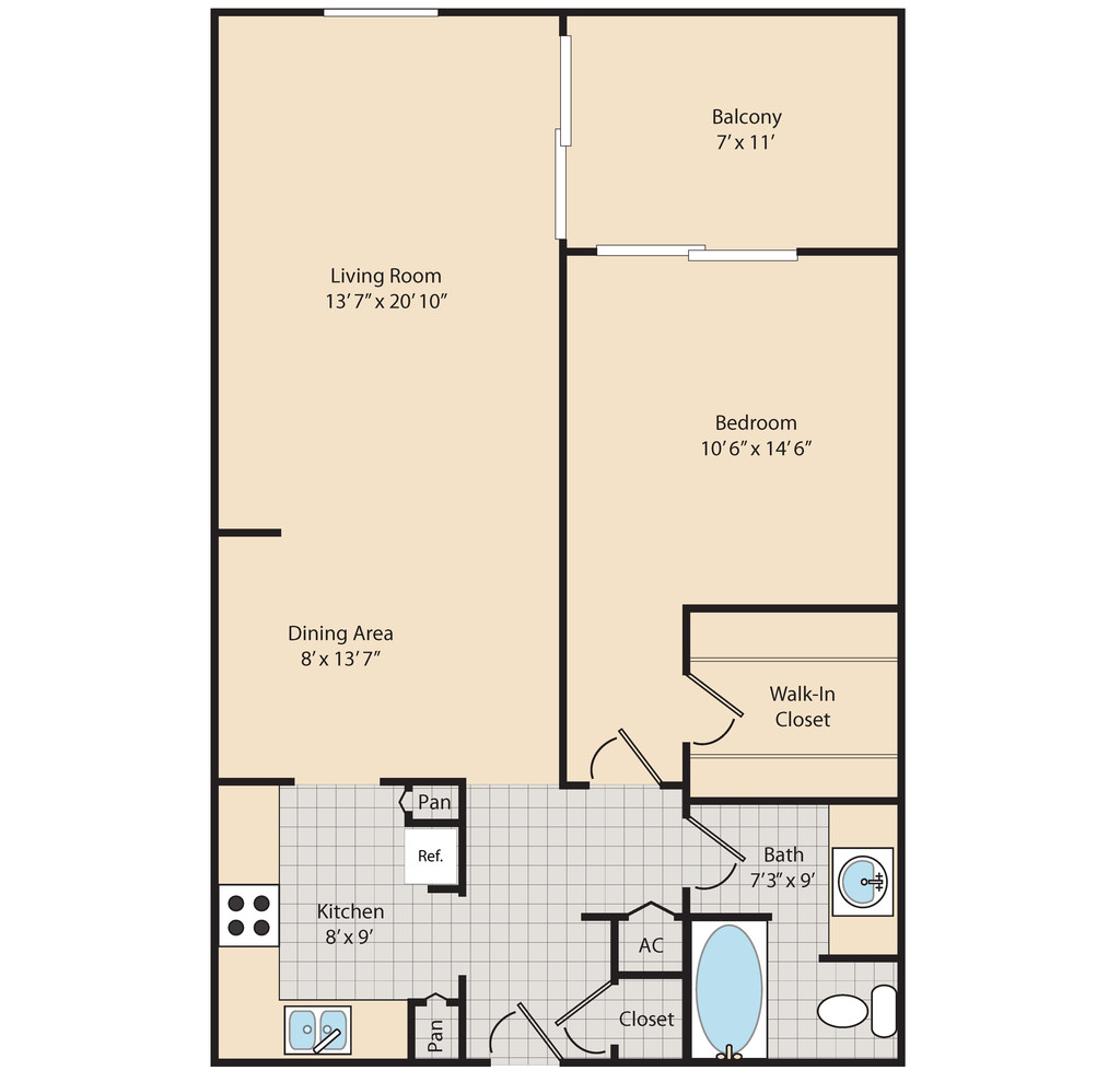 1 Bed, 1 Bath, 840 sq ftAvailable NowLargest 1 BedroomThis is the largest 1 Bedroom at this PropertyModel Gallery