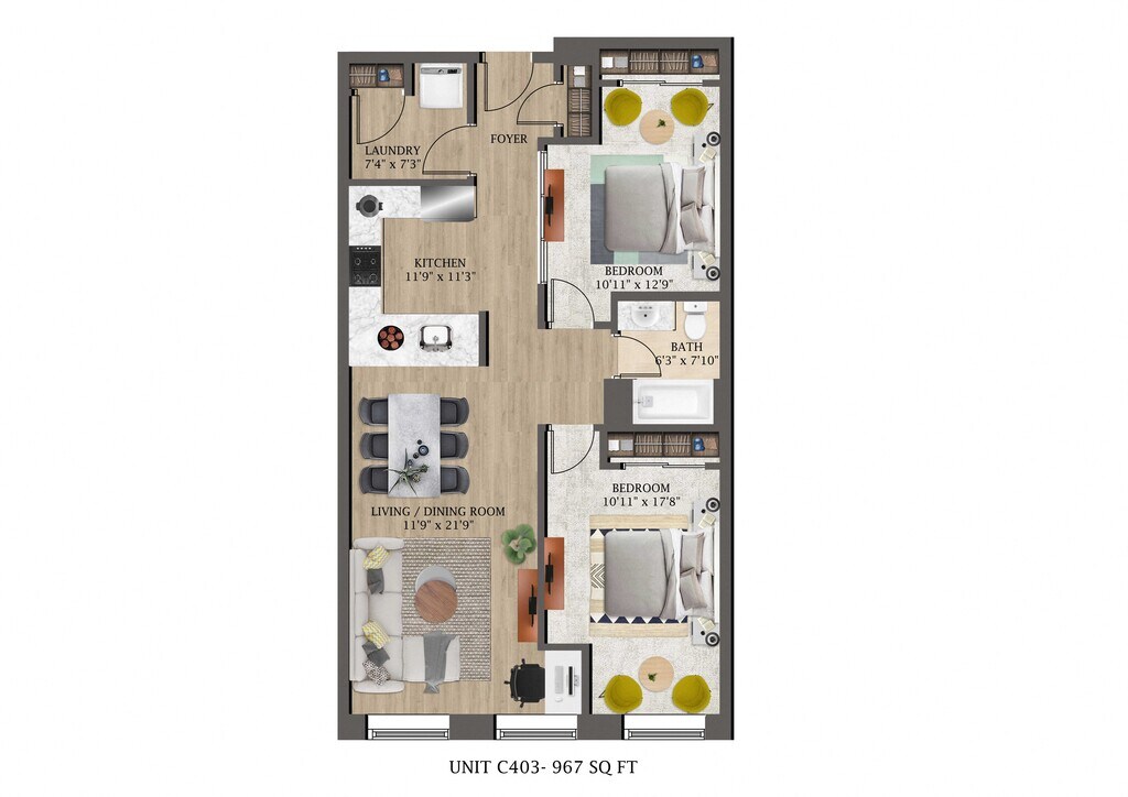 One Bedroom + Den - Floorplan 6 Apartment Unit: C217Apartment Model: One Bedroom + Den$2,8901 Bedroom, 1 Bath, 1045 sq ftAvailable NowApartment Unit: C411Apartment Model: One Bedroom + Den$2,7901 Bedroom, 1 Bath, 967 sq ftAvailable NowApartment Unit: C413Apartment Model: One Bedroom + Den$2,7901 Bedroom, 1 Bath, 967 sq ftAvailable Now2 Bedrooms