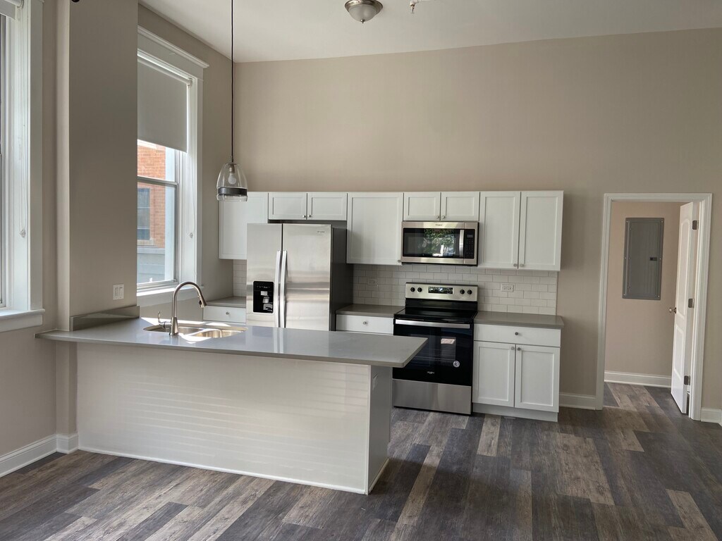 The Church Street Apartments are the most unique and exciting rental offering around. A 100-year old school, Faith Immanuel High School, was converted to brand-new, beautifully constructed apartments. The skeleton of the original school was kept intact, allowing the developer to preserve many of the charms of the old high school from back in the day, including original ceramic tiles in the hallway, double-doors between wings, bulletin boards, outdoor decorations, and the overall architectural style. Once you step through your apartment door, however, everything is brand-new. New cabinets and vanities sit atop fresh vinyl flooring, and kitchens are outfitted with new stainless steel appliances. Each apartment is given a nickname reminiscent of the building's history as a school, such as "Biology" or "Detention". In addition, the conversion process allowed for each unit to have a unique layout, including larger bedrooms, spacious living rooms, and island/peninsula kitchens. Our trilevel three bedroom offerings include massively tall ceilings, creating a sense of expanse within the kitchen and living room. Outside the loft are original wooden beams holding the roof over what used to be the gym. Bathtubs are outlined in new stone tiles, and each unit includes an in-unit washer and dryer. You will likely never find an apartment quite as unique or charming as the new luxury apartments located at 174 S McHenry Ave. Call ahead to see them for yourself!