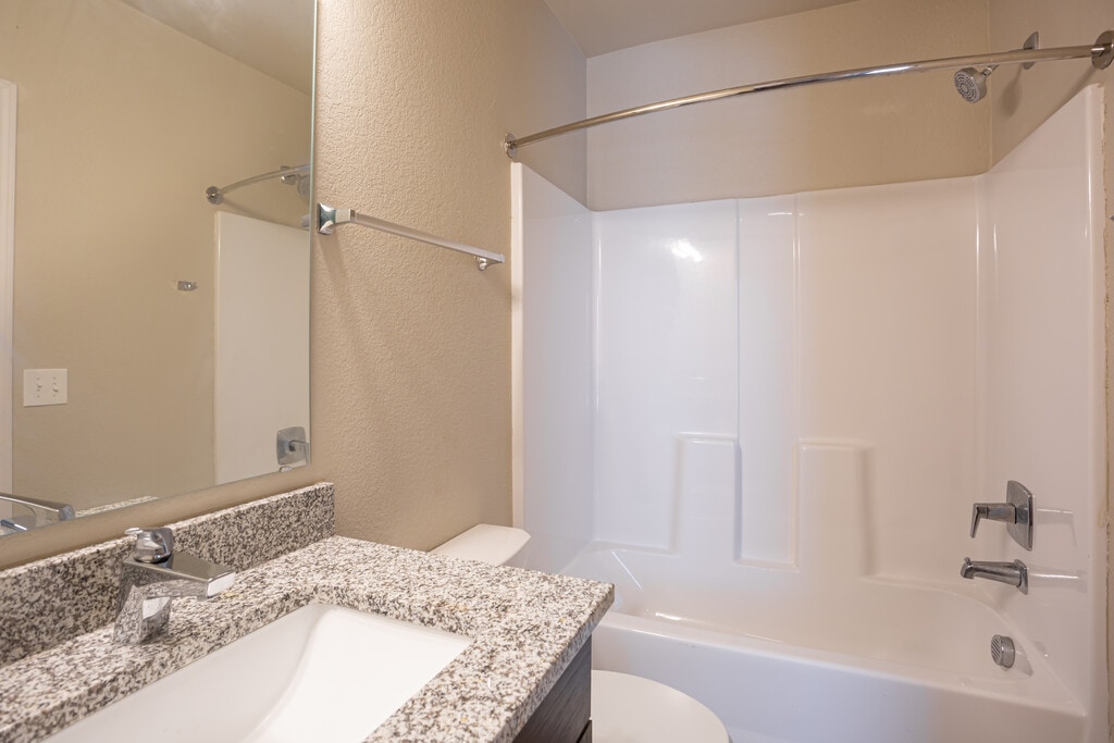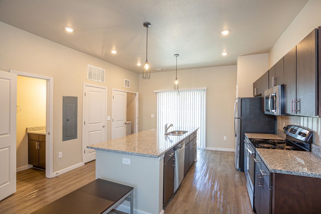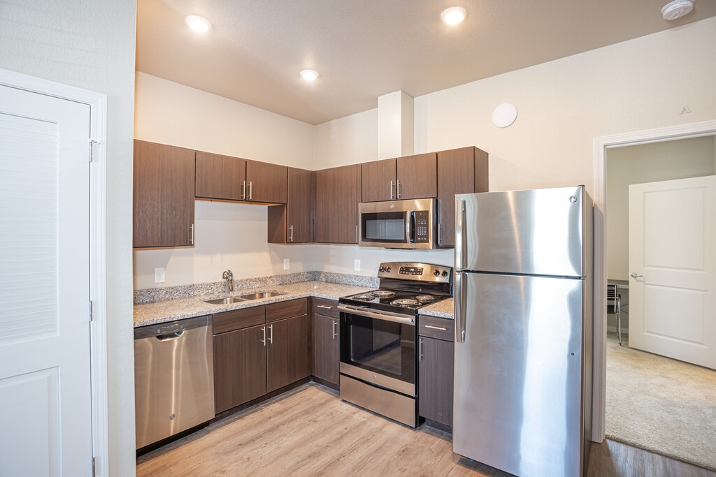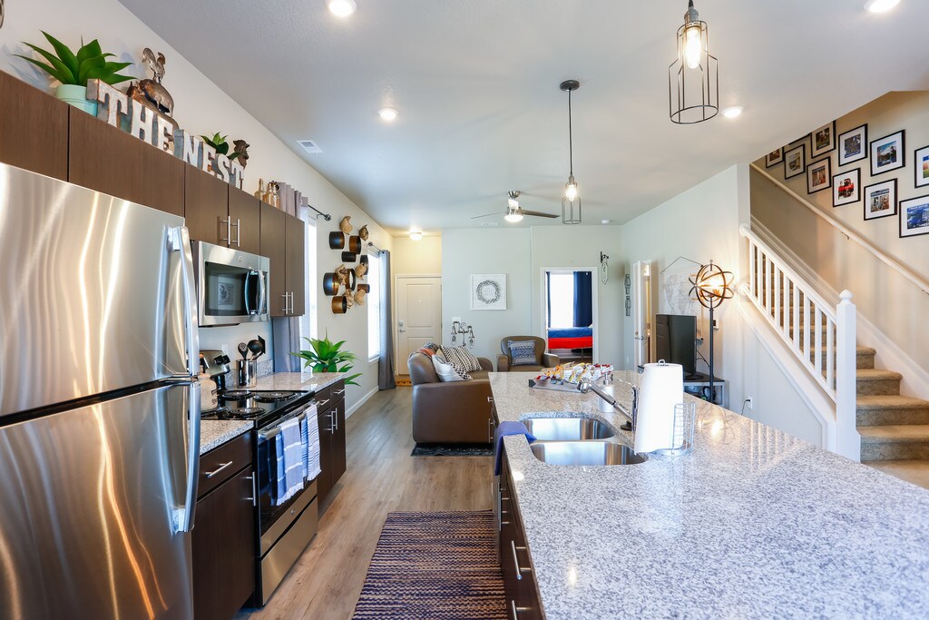 - Granite countertops + stainless steel appliances