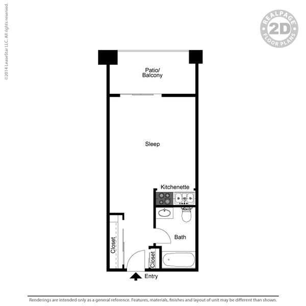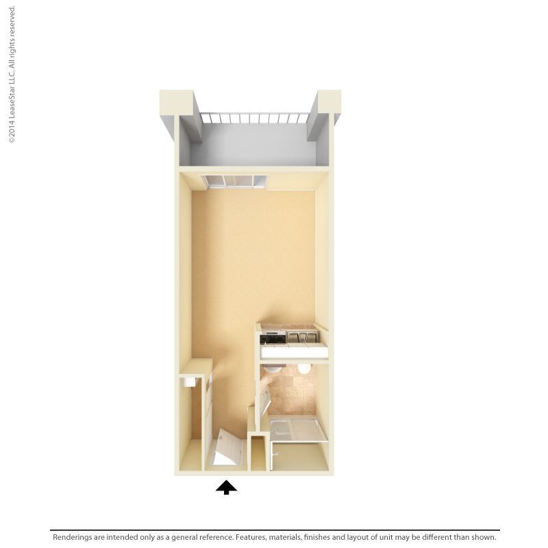 Studio - Floorplan 5 Floor plans are artist's rendering. All dimensions are approximate. Actual product and specifications may vary in dimension or detail. Not all features are available in every rental home. Prices and availability are subject to change. Base rent is based on monthly frequency. Additional fees may apply, such as but not limited to package delivery, trash, water, amenities, etc. Deposits vary. Please see a representative for details.