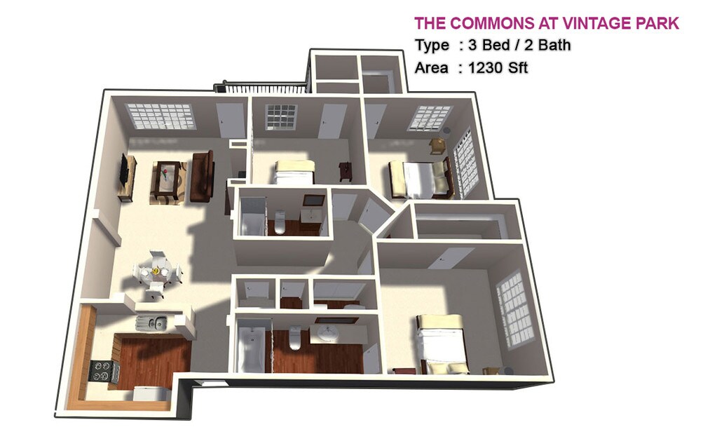 3 Beds, 2 Baths, 1230 sq ftModel Gallery