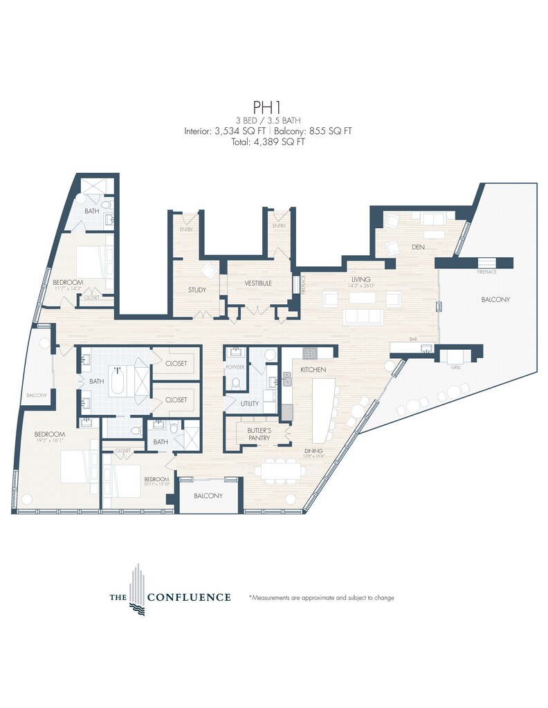 The Confluence offers Studio to 3 Bedroom apartments starting from $1,749 and having 482–3,534 sq ft. Here is the current pricing and availability: