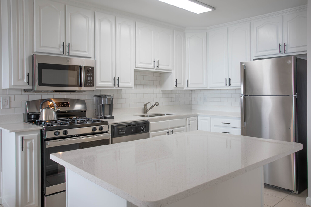 - Stylish modern kitchen with sleek white cabinetry, stainless steel appliances, and a cozy dining set